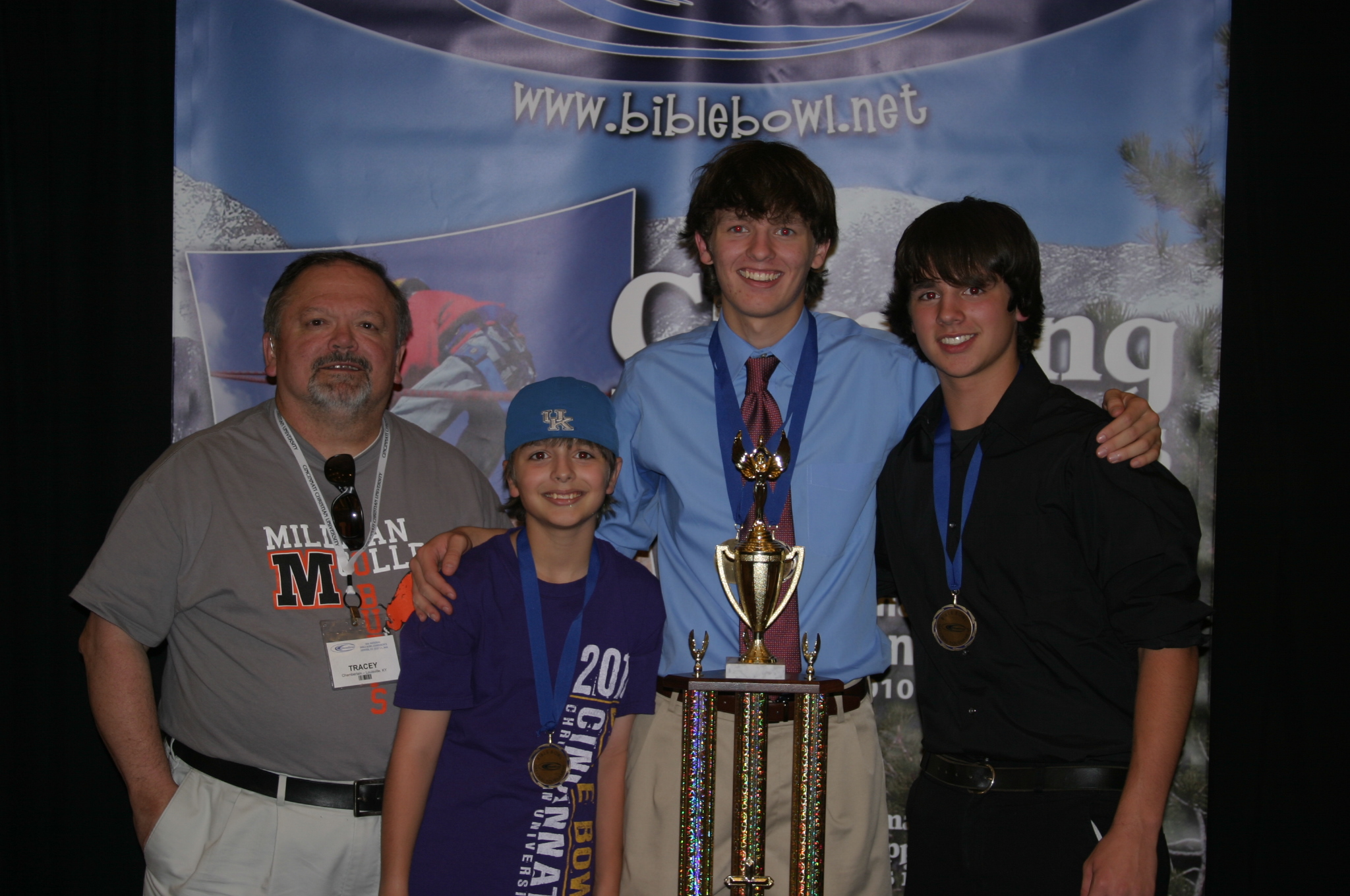 1. Lisa Rolston. Bible Bowl leaders of larger programs have so much work that goes unnoticed. From finances to renting vans to college/nationals registrations to medical releases to parental dealings (know-it-all types like me) to making all of the pieces fit on a four-man team to, well, you name it. Lisa has always been one of Christian’s biggest fans. I can remember her coming to watch him play as a 5th grader in Indy. It was there that April and I began repeating for the many years to come her often used phrase, “You never know.” We’d ask if she thought we could beat this team or that team and she almost always used this answer. We played with Southeast for five of the next seven years (we stopped going to SE as a family in 2003 but they were always kind to welcome us to play with them) and Lisa was an integral part of all of those years. She coached Christian, Haley and Rachel to their first National Championship in 2008. I would drop Christian off at her house numerous times over the years on my way to work, she would quote with him most of the day, then I’d pick him up on my way home from work – not just the year that she coached him but all throughout his career. She is actually the first one that introduced Bible Bowl (in 1999 when the text was Genesis) and homeschooling to our family – she invited April to ‘shadow’ her in the late 90’s (I think) while she taught Ashley, Eric and Kayla. April came home from that confident that she could teach our little ones. Lisa has had an impact on our family far beyond the game. After her two teams were out of the double elimination this year, nothing warmed my heart more than seeing Lisa and Ashley (and most of the Southeast folks) following our boys, cheering them on. I don’t think I got to see her after the Championship Rounds but I’m sure she was hoping for nothing but the best for the boys. I’m glad that she was there – the lady that introduced our family to this program some 11 years before, was there rooting for the boys, watching what would be the crowning achievement for our three boys (and, indeed, our whole family) in the program. So thanks Lisa – thanks for encouraging a young 25 year old mother to homeschool and thanks for introducing and encouraging our family to participate in this game – what a ride it has been! (I couldn’t find a picture of Christian with Mrs. Rolston.)